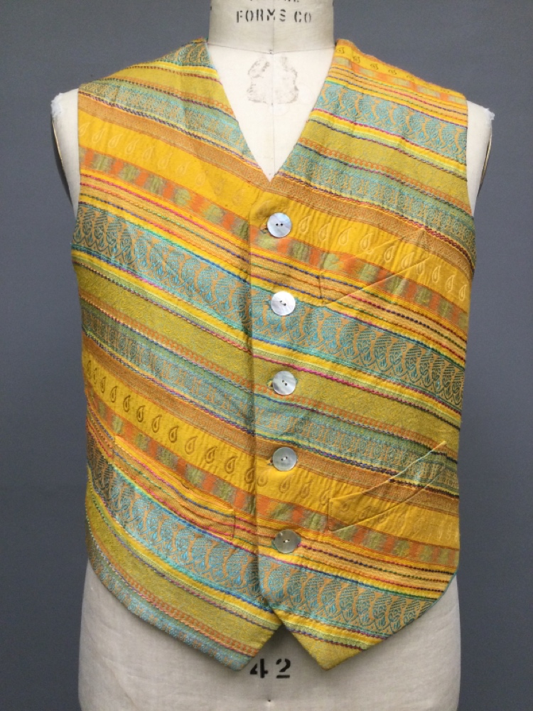 Mustard Yellow, Aqua Blue, Orange, Raw Silk, Brocade, Stripe, Five Shell Buttons at Center Front, Left Breast Pocket, Two Slanted Waist Pockets, Contrast Blue Silk Back with Adjustable Waist Belt. "The Importance of Being Earnest" OSF Season 2025., Good Condition, Importance of Being Earnest |