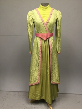 1910, Light Green, Pink, Silk, Brocade, Floral, Crosoover Front With Pink Lace Trim, V Shaped Pink Belt, Gathered Sleeves At Shoulder, Slim Fitt At Wrist, Long Sides With Pink Trim,To Be Worn Over Skirt,, Good Condition