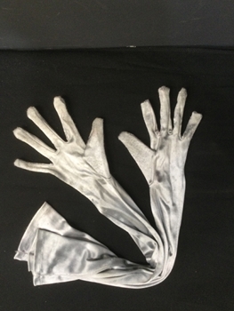 Silver, Spandex, Nylon, Shiny, Knit, Dyed, Red Staining, Snags on Fingertips, Fair Condition