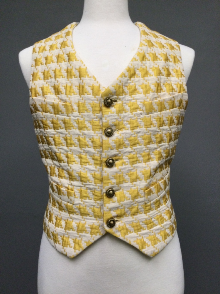 Yellow, White, Linen, Cotton, Houndstooth, Large Scale Yellow Houndstooth Pattern Vest, Five Button Front, Gold Filigree Buttons, Two Slanted Waist Pockets, Blue and White Striped Satin Back with Adjustable Waist Belt. "The Importance of Being Earnest" OSF Season 2025., Good Condition, Importance of Being Earnest |