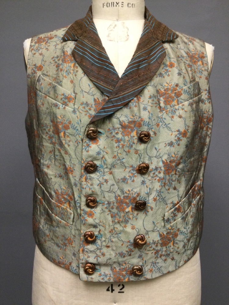 Taupe, Copper, Aqua Blue, Brocade, Silk, Floral, Stripe, Regency, Double Breasted Vest, Contrasting Notched Lapel, Ten Button Front with Iridescent Copper Swirl Deco Buttons, Two Welted Breast Pockets, Two Welted Waist Pockets, Iridescent Brown and Blue Silk Contrast Back with Subtle Floral Design, Adjustable Waist Belt. "The Importance of Being Earnest" OSF Season 2025., Good Condition, Importance of Being Earnest |