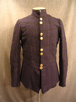 RENN, Navy, Black, Wool, To Be Worn Under Robe, Stand Collar, 4 Set Of Gold Buttons Center Front With Zipper Underneath, Black Braid Trim Sewn In Chevron Pattern On Front And Sleeves, V Shaped Waist, Peplum, Black Satin Back With Lacing,, Good Condition