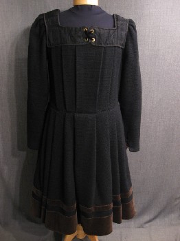 RENN, Black, Brown, Wool, Weave, Square Neck With Jaquard Trim And Lacing Detal, Body And Skirt Pleated Into Waist Seam, Center Back Zipper Closure, Velveteen Border At Hem, Long Sleeve, Tudor, Good Condition