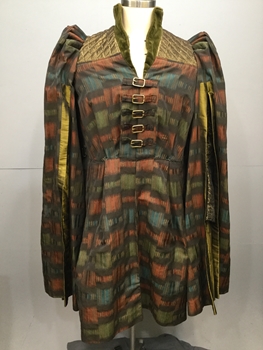 RENN, Green, Rust, Turquoise, Cotton Blend, Abstract, Stand Collar, Center Front buckle closure, open hanging sleeves with slim sleeves underneath, houppelande, Good Condition