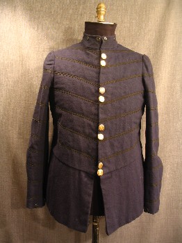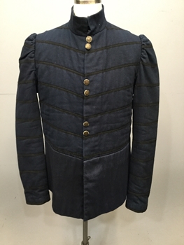 RENN, Navy, Black, Wool, To Be Worn Under Robe, Stand Collar, 4 Set Of Gold Buttons Center Front With Zipper Underneath, Black Braid Trim Sewn In Chevron Pattern On Front And Sleeves, V Shaped Waist, Peplum, Black Satin Back With Lacing, Good Condition