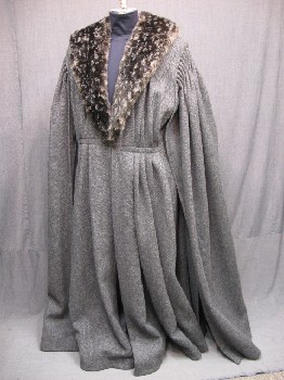 RENN, Charcoal, White, Wool, Faux Fur, Herringbone, Shawl Collar, Long Hanging cartridge pleated Sleeves Cartridge Pleated, Gathered Waist, houppelande, medieval, renaissance, Good Condition