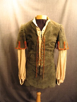 Green, Tan, Leather, Cotton, Solid, Green Leather Jerkin With Faux Tan Cotton Shirt Underneath Laces Up Center Front Castelated Sleeves On Jerkin, Long Sleeves With Small Band On Cotton Shirt Gimp Trim On Sleeves, Good Condition