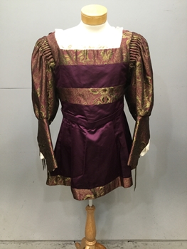 RENN, Purple, Gold, Silk, Floral, Brocade, Square Neckline With Ruffle Trim, V Shaped Waist,Skirt With contrast hem, Cartridge Pleated Sleeves, Slim Fit From Elbow Down, ,points And Bows On Lower Sleeve With faux undersleeve, Good Condition