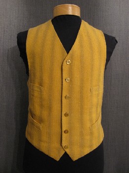 20thC, Yellow, Green, Wool, Stripe, No Collar, No Lapel. Yellow Striped Front, 6 Buttons, 4 Welt Pocket, Green Striped Rayon Back With Buckle Tie, Good Condition
