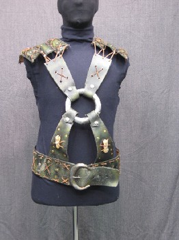 Green, Black, Gold, Leather, Stitched, Medieval Leather Harness, 2 Shoulder Straps Linked Together With Leather Cord, Gold Stud Details, Large Foam Silver Ring at Center Front and Center Back, Bone Detail And Stitching, Attached To Wide Belt With Round Silver Buckle, Age and Mud Distressed, Distressed