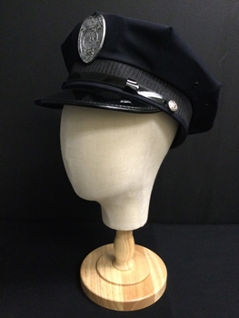 Modern, Black, Silver, Polyester, Solid, Modern style, Black octagonal body, Hard Plastic visor w/ patent pleather top/edge, Silver "LCPD" Badge sits above black nylon & plastic webbed band, patent pleather strip w/ silver button on each end sits above visor, Good Condition