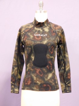 Mako, Black, Brown, Tan, Polyester, Spandex, Camouflage, Abstract, Rash Guard, Raglan Sleeve, Mock Turtleneck, Pullover, Sewn On Padding Patch at CF., Good Condition