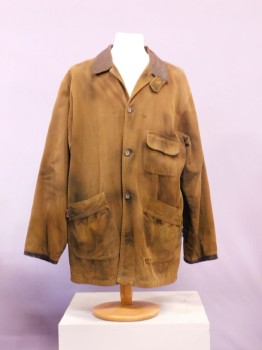 Khaki, Cotton, Nylon, Zip and snap front closure, Utility, Paint/Mud Splatter at Center Front, tricot lining, front velcro patch pockets, stand collar, long sleeve, Distressed