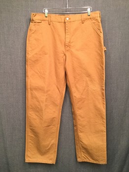 Carhartt, Tan, Denim, button & zipper fly, 8 Pockets, hammer loop on left, Good Condition