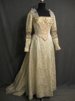 16thC, Cream, Gold, Metallic, Brocade, Boned Bodice With Long Sleeves, Square Neckline Trimmed With White Ruffles And Crystals, Gold Applique On Body, Split Brocade Sleeves With Sheer Puffs At Elbows With Gold And Pearl Trim, Good Condition