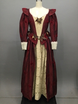 Burgundy, Cream, Silk, Diamond, Floral, Scoop Neckline Trimmed In Floral Lace, Cream Center Panel w/ Burgundy Bow, Bows On Waist Seam, Velvet Flowers On Fabric, Shoulder Wings, 3/4 Length Fitted Sleeves w/ Wide Detachable Cuffs Trimmed in Lace, Center Back Zipper w/ hooks, Good Condition