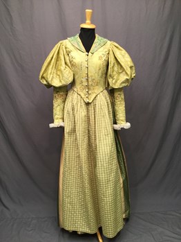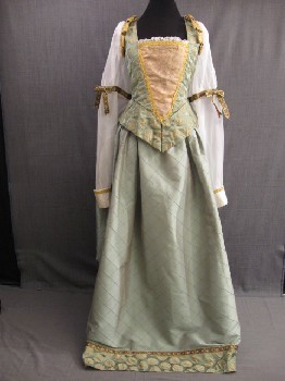 Light Green, Gold, White, Silk, Self Dot, Floral, Square Neckline, V Shaped Gold Floral Boned Inset Center Front With White Lace Trim At Top And Gold Trim All Around. Sheer White Long Puff Sleeves, Gold Braid Shoulder Panes, Green Circle Pattern Fabric Sides And Back Peplum, Center Back Zipper, Good Condition