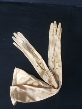 Kay Fuchs, Peach, Beige, Nylon, Satin, Knit, Opening at Wrist, Three Rhinestone Buttons, One Missing on L Hand., Good Condition